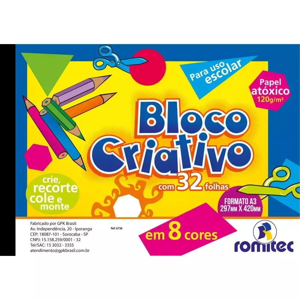 O Bloco criativo ROMITEC é um livro pedagógico com atividades como colagem, dobradura e recorte, pode ser usado em atividade escolar e como entretenimento. Além do livro, o produto acompanha 32 folhas coloridas, 8 cores vibrantes, produto 100% reciclável e atóxico.